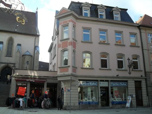 Der Laden befindet sich im Erdgeschoss eines Denkmalgeschützten Wohn- und Geschäftshauses, Baujahr 1893 neben Optiker Kuhn.